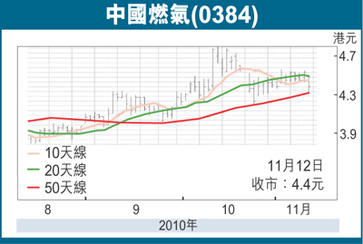 值得一提的是,中燃上月剛完成配股,以每股作價4.31元,集資淨額約30.7億元,在完成配售集資後,公司淨借貸比率由原本的132%降至46%。中燃多年來一直全力拓展,也因而令負債比率大增,如今成功減債,有助消息市場疑慮。集團管理層曾表示,旗下的液化石油氣業務去年扭虧為盈,若業務規模及盈利符合目標,會考慮分拆上市,一旦落實,其財政實力更為雄厚。此股上周五以4.4元報收,現價只是稍為高於配股價,也是其具吸引之處,而股價上周在退至4.32元獲得支持,反映50天線(4.33元)的支持力漸顯。趁調整上車,中線上望目標為年高位的5.03元。