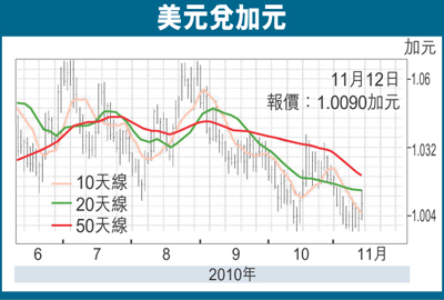 另一方面,受到市場仍較為憂慮愛爾蘭財政問題的情況下,歐元匯價暫時將仍會受到一定壓力,該情況將會對商品貨幣的表現構成負面影響,再加上金價以及油價於上周尾段的急速下跌,亦會進一步不利於商品貨幣的走勢,故此不排除加元匯價短期仍會處於反覆偏弱的表現。