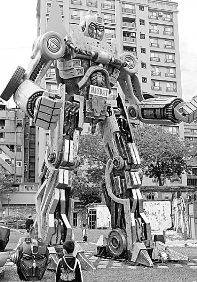 一個約6層樓高、重達5噸的變形金剛,近日亮相台北西門町一帶。這原是樂團「五月天」演場會上出現過的巨型模型。台北市文化局為呼應台北花博,而實施將大型裝置藝術導入老社區。 中新社