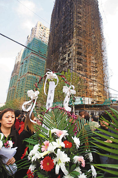 ■18日,市民絡繹不絕地自發前往上海膠州路「11·15」火災現場悼念逝者。 中通社