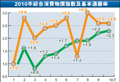 政府統計處昨公布最新消費物價指數,10月份基本通脹率為2.3%,較9月份的2.2%略高,反映通脹進一步加劇。以今年首10個月合併計算,綜合消費物價指數較去年同期上升2.3%,若剔除所有一次性紓困措施,首10個月基本通脹率,按年上升1.5%。