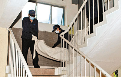 ■仵工在中大教職員宿舍芝苑將死去多日內地研究助理遺體舁離。