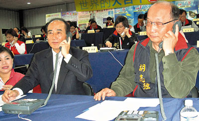 ■立法院長王金平24日到國民黨台中市長候選人胡志強競選總部,為胡志強賣力打電話催票。中新社