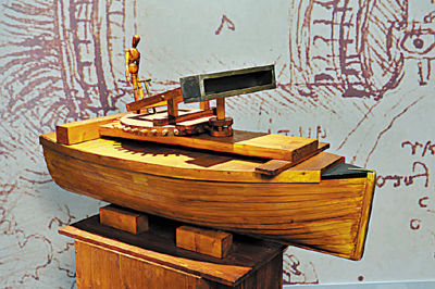 海軍大炮:海軍武器是達文西甚感興趣的領域之一。他計劃在特製的小船上裝有一個旋轉台,台上有數排大炮,又或是在小船上安裝大型迫擊炮,發射燃燒彈,擊沉敵軍的船隻。