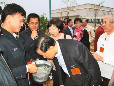 ■雷添良、王如登、羅范椒芬等多名港區人代,先後探身狀似「聞水」,以了解水質狀況。