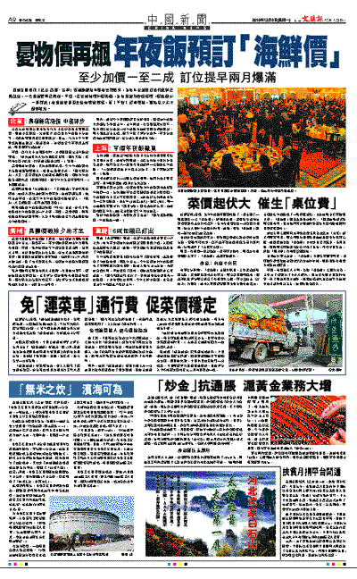 今年各種農副產品的價格均創下了歷史新高,也影響到了年夜飯市場。與往年相比,今年各酒樓的年夜飯都有了不同程度的價格調整,漲幅大致在10%左右。有酒樓負責人稱,即使提升了價格,酒樓也對能否保本心裡沒底,「現在物價變化太快了,春節期間肯定還會有一波漲價。」亦有餐館老闆稱,今年之所以漲價,完全是因為今年物價水平高於去年。