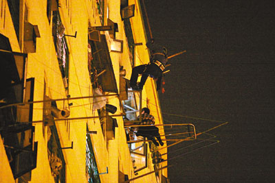 ■消防「飛將軍」游繩而下,拯救危坐晾衣架女子。