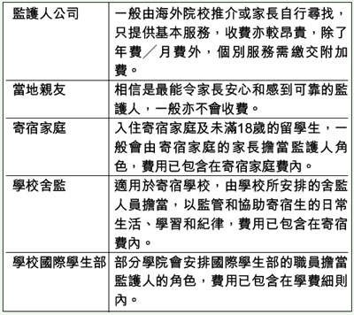在英國,所有入讀傳統私立寄宿學校的海外學生,亦必須要有居住在當地的公民作為監護人。監護人負責在學校假期間為留學生安排住宿(一般入住監護人家中或另外安排寄宿家庭予學生居住)、代為辦理回港度假的機票、甚至安排機場接送等服務。大部分家長會透過學校的協助,申請監護人公司所提供的監護人服務。當然,家長亦可委託居住在當地的親友作為學生的監護人。