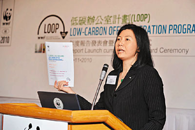 由WWF推行名為「低碳辦公室計劃」(Low-carbon Office Operation Programme,簡稱LOOP)的碳足跡標籤認證計劃於去年成立,主要協助以辦公室為主的企業量度碳足跡,並制定措施減少日常營運所造成的碳排放。這次計劃共有60家以香港為基地的本地及國際企業參加,當中有14家企業於計劃首年已成功完成標籤認證程序。何美娟認為,商業機構作為香港最大的能源使用者,應該為應對氣候變化肩負責任。要做出成效,企業不僅要有心參與,還要很下功夫搜集、記錄數據作分析。LOOP分析了參與企業首年的碳排放數據及減排成效,在減排表現中,發現香港的辦公室在紙張使用、列印和影印類別的表現較好。但何美娟表示,分析同時揭露了有待改善的減排範疇——照明系統、冷氣調節及商務旅行。