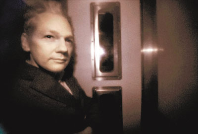 ■阿桑奇昨乘警車前往法院出席引渡聆訊。法新社