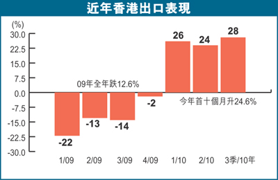 香港文匯報訊 (記者 李永青) 受惠於中國市場強勁、電腦換機潮及市場推出多款新型智能手機,今年十個月香港整體出口額按年大升24.6%,香港貿發局更將今年全年出口額增長預測,由6月份的12%大幅調升至21%。該局首席經濟師梁海國解釋,很多企業在金融海嘯期間凍結電腦換機計劃,這批購買力在今年全面釋放,加上推出iPhone等新款智能手機及很多人在世界盃前更換電視機,均大大刺激電子類產品銷量,推高本港出口額。