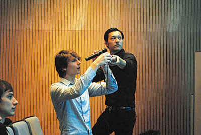 ■藝遊鄰里計劃留駐藝術家曹飛颺示範他的互動作品。