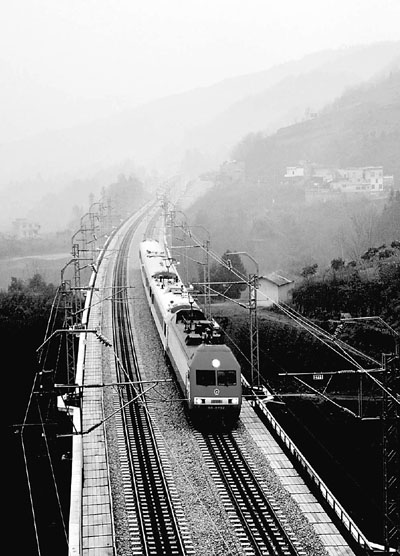 ■中國建設難度最大的山區鐵路—位於湖北恩施土家族苗族自治州的宜萬鐵路,將於22日舉行正式通車儀式。圖為19日,一輛檢測車行駛在宜萬鐵路上。 新華社