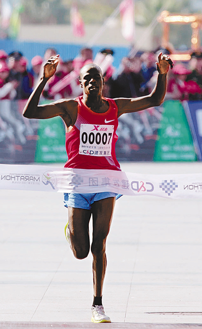 ■肯尼亞選手凱伯科里爾衝過終點。 新華社