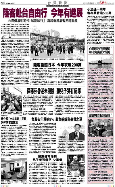 據台灣《中國時報》報道,醞釀多時的陸客赴台自由行,兩岸已經達成共識,今年大陸旅客確定開放來台自由行,採「試點試行」,先開放上海、北京兩個城市居民,每天以500人為上限,開放時間點約在清明節,並稱這是兩岸分隔62年,陸客首次可來台「趴趴走」。報道還透露,赴台大陸客必須達一定身份資格:在公安部門無不良紀錄、具存款或房地產證明、年工資15萬人民幣(台幣約75萬)以上、取得銀行金卡等五條件至少要符合兩項。