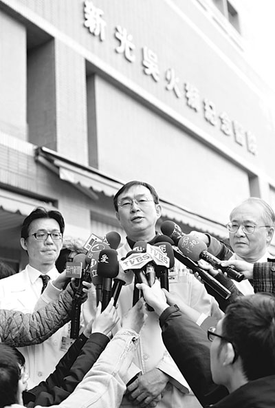 ■ 孫穗芬經30多小時救護,傷勢有所改善,圖為台北新光醫院外傷科主任陳慶霖介紹救護情況。 中新社