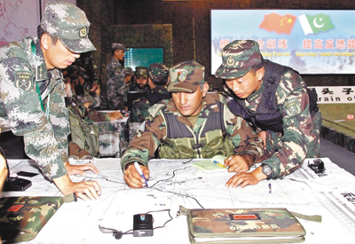 ■2010年7月8日,「友誼-2010」中巴反恐聯合訓練進入綜合演練階段。中巴反恐聯合演練指揮員、AB兩連連長在分析判斷情況。