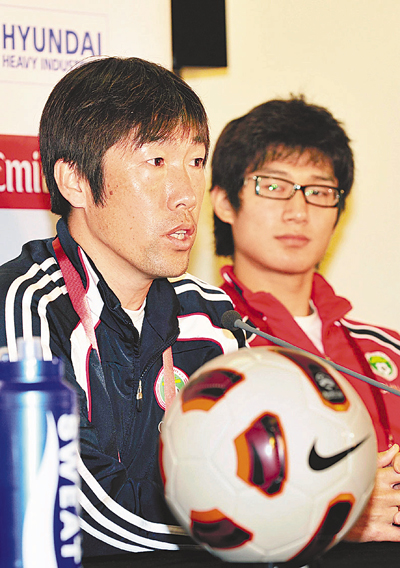 ■高洪波(左)與隊員于海出席賽前新聞發佈會。 新華社