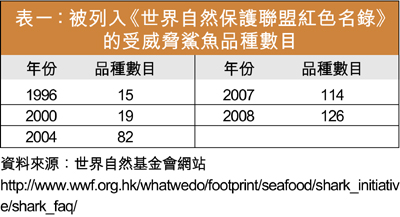 根據有關機構估計,每年約有7,300萬至1億條鯊魚被殺,有關數字且以每年6%增長。鯊魚成長速度緩慢,產子量少,以大西洋中的短尾真鯊為例,需要至少到廿歲才可繁殖後代。過度捕撈令鯊魚的數目正在逐漸下降,部分物種的生存亦受到威脅。全球有547種鯊魚,在2008年有126種被《世界自然保護聯盟紅色名錄》列為瀕臨絕種威脅,較1996年的15種多7倍 (表一)。