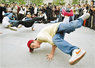■源於美國的Hip-hop文化在中國主要城市大受歡迎。圖為一群青年在杭州街頭表演霹靂舞。 資料圖片