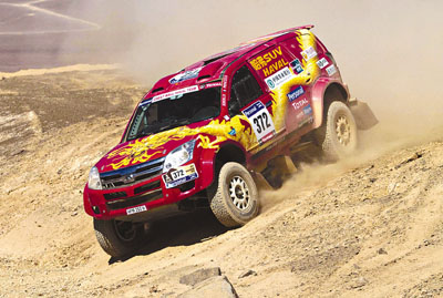 據新華社10日電 第33屆達喀爾拉力賽10日舉行了第八賽段的比賽,中國長城哈弗車隊的周勇(左圖)繼續保持出色的競技狀態,在本賽段獲得了第16名的好成績,在總成績排行榜上的排名也上升到第17位,突破了他本人創造的中國車手在達喀爾拉力賽上取得的第19名的最佳成績。目前周勇和他的龍騰戰車的磨合已經非常到位,在最後四個賽段中能否保持穩定的狀態和出色的發揮,對於他能否在本屆賽事上突破自己創造的中國車手在達喀爾拉力賽上的最佳成績至關重要。