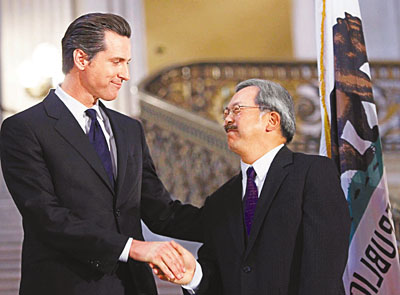■轉任加州副州長的紐瑟姆(左)大讚李孟賢是有道德操守的人。美聯社