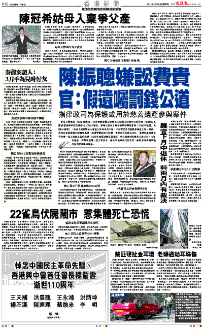 爭產案原審法官林文瀚去年裁定陳振聰敗訴,指他蓄意透過法庭程序,圖藉虛假遺囑騙取利益,下令陳須以懲罰性基準,支付華懋一方的訟費,以及臨時遺產管理人費用,金額分別為1.4億元及8,400萬港元。陳振聰一方陣營代表律師昨晨就訟費提出上訴。