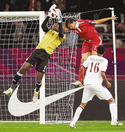 ■卡塔爾門將(黃衫)成功化解中國隊(紅衫)的攻門。法新社