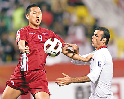 昨晚卡塔爾亞洲盃D組次輪角逐,朝鮮隊下半場失守,以0:1不敵伊朗,伊朗兩戰全勝居榜首。圖為朝鮮前鋒鄭大世(左)搶波。 路透社