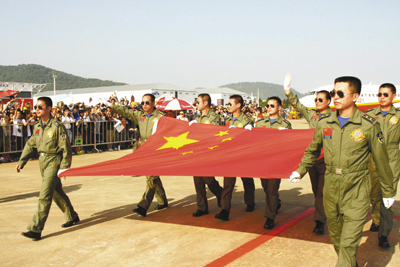 ■去年11月21日,珠海航展閉幕,八一飛行表演隊隊員手持國旗,向熱情的觀眾揮手告別。
