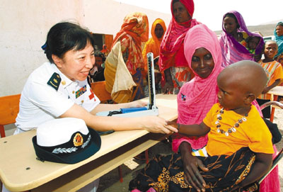 ■海軍總院「南丁格爾」獎獲得者王文珍在為吉布提兒童體檢。