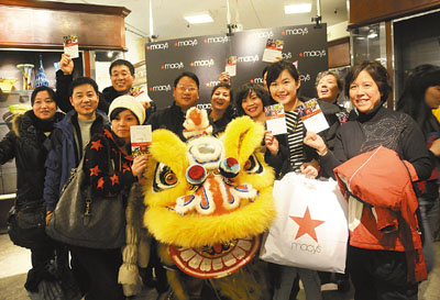 ■今年春節北京、廣州多家旅行社將再組千人團赴美國洛杉磯等地旅遊。圖為去年春節,中國千人團的部分遊客展示紐約梅西百貨贈送的「國際優惠卡」。 資料圖片
