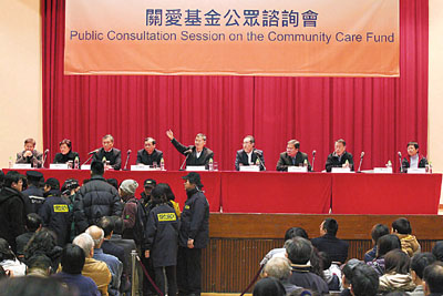 關愛基金督導委員會主席、政務司司長唐英年昨日聯同該會屬下教育、醫療、福利及民政小組8名委員,出席在沙田舉行的關愛基金第二場地區諮詢會,聽取社福機構代表及基層市民的訴求,逾百名社會福利機構、弱勢社群代表,包括嚴重殘障者,自閉青年及基層市民出席。