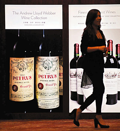 ■蘇富比拍賣行昨在香港舉行紅酒拍賣,出售英國歌劇大師韋伯的紅酒珍藏,746批佳釀共售得約4,363萬港元。圖為一名女士步經拍賣宣傳海報。 法新社