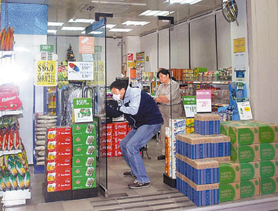 ■警方鑑證科人員在油站小賣部的玻璃門上套取指模。
