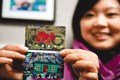 由上海金山農民畫院推出的生肖題材公交卡,以新農村農民養兔致富為原創題材,作者邱建國通過演繹一家人養兔即景,生動展示當代農民幸福生活,畫面呈現滿園春色與和諧幸福,同時剪紙卯兔圖案鮮活,寓意兔年吉祥。中新社