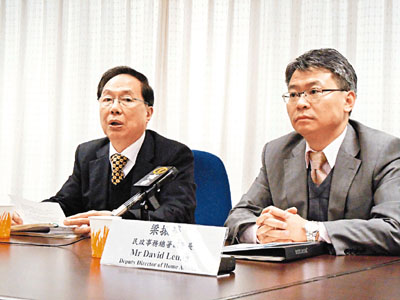 ■民政事務總署副署長梁振榮(圖右)表示,在630幢未購買第三者風險保險的物業中,有3分1因為法團不活躍。香港文匯報記者曾偉龍 攝