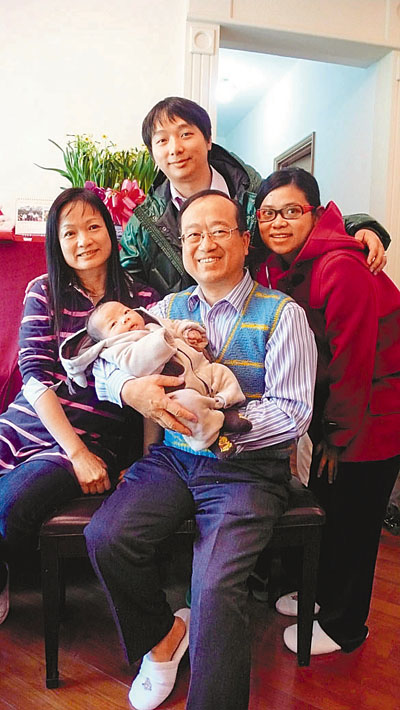 ■陳鑑林偕妻子、兒子、媳婦及剛滿月的乖孫,三代同堂樂享天倫。香港文匯報記者鄭治祖 攝