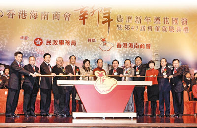 贊助今年賀歲煙花匯演的香港海南商會,年初二晚在灣仔會展大會堂隆重舉行新春酒會。特區行政長官曾蔭權,中聯辦副主任黎桂康,外交部駐港副特派員李元明,海南省副省長林方略,立法會議員黃定光,中聯辦九龍工作部部長林武,民政事務總署署長陳甘美華,全國政協常委、香港僑界社團聯會會長余國春,香港中華總商會會長蔡冠深出席主禮。
