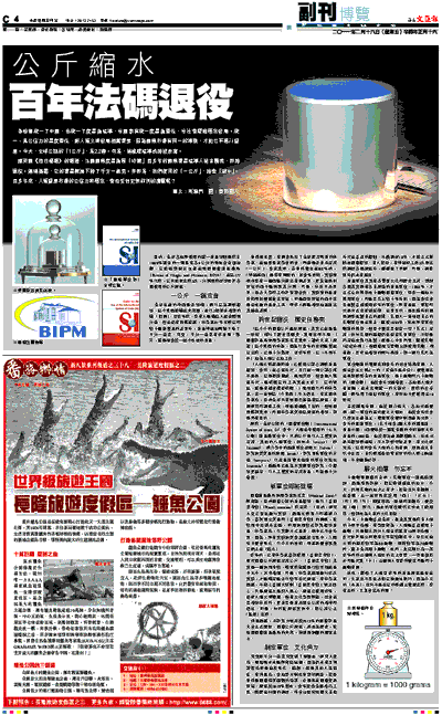 據英國《每日郵報》的報道,法國國際度量衡局「珍藏」百多年的國際重量標準人造金屬塊,即將退役。傳媒揭露,它的重量輕微下降了千分一毫克。亦即是,我們使用的「一公斤」,將會「縮水」。百多年來,人類貿易市場的公信力和穩定,會否受到史無前例的衝擊呢?