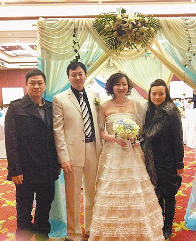 香港羽毛球名將、前國手周蜜(右二)昨與相戀多年的男友胡潔在北京喜結連理。好友紛紛到場祝賀、獻上誠摯的祝福。 網上圖片