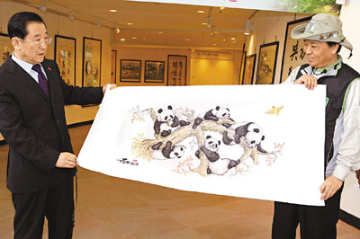 ■賈治邦(左)向台北市立動物園園長葉杰生贈送大熊貓畫作。 中新社