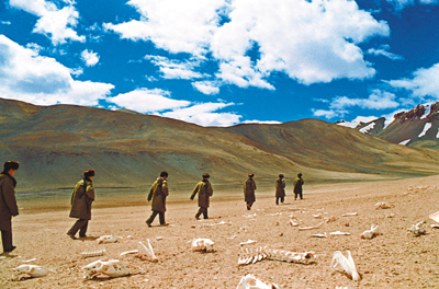 ■1994年9月,駐守天下第一哨——神仙灣的官兵在遍地白骨的巡邏道上艱難跋涉 。這裡海拔5,380米,年平均氣溫零下9度,養不活毛驢,種不活草木,劃不著普通火柴,可敬的邊防軍人在這裡駐守了38年。