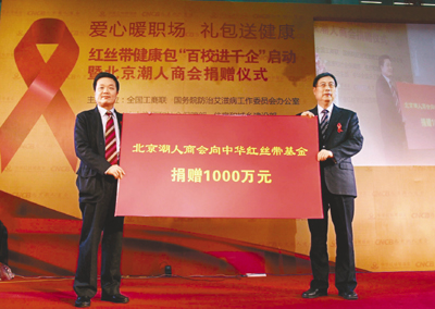 香港文匯報訊(記者 王添翼 北京報道)致力於愛滋病防控工作的全國性公益組織——中華紅絲帶基金會,25日在京獲北京潮人商會捐贈善款1千萬元。全國政協副主席、全國工商聯主席、中華紅絲帶基金名譽理事長黃孟復出席捐贈儀式,並向北京潮人商會會長、港商張章筍表示感謝。