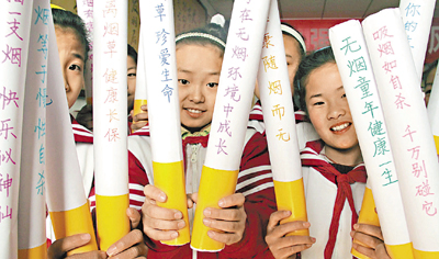 有中國小學生用報紙等製作「香煙」模型,並寫上忠告,勸導家長戒煙。 資料圖片