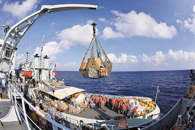 ■「鏡泊湖」艦在南沙永暑礁錨地為拖船吊裝補給物資。
