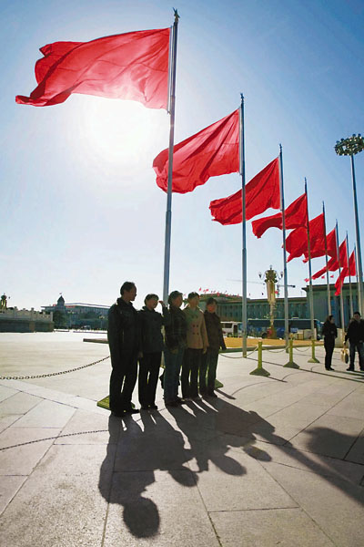 ■北京天安門廣場紅旗招展,迎接「兩會」召開。 美聯社