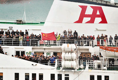 ■當地時間28日中午,中國駐馬耳他大使館租用的第三艘用於撤離在利比亞中方人員的客輪抵達馬耳他首都瓦萊塔大港,船上同胞拉起國旗歡呼。新華社
