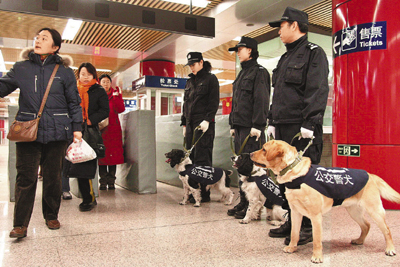 ■北京警方攜犬在地鐵執勤,協助搜查危險物品,保障乘客安全。 資料圖片