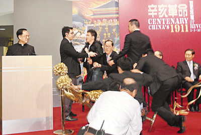■民政事務局局長曾德成奮不顧身擒抱示威者,阻止對方向特首(左一)施襲。